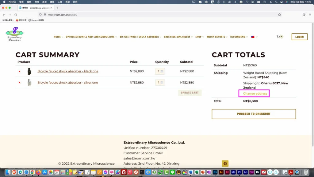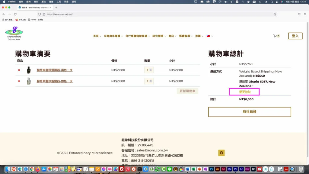 運費是依照國家與商品重量來計算,所以請先選點選「變更地址」,填選「所在國家」與「商品數量」,再「更新購物車」,以便計算運費。